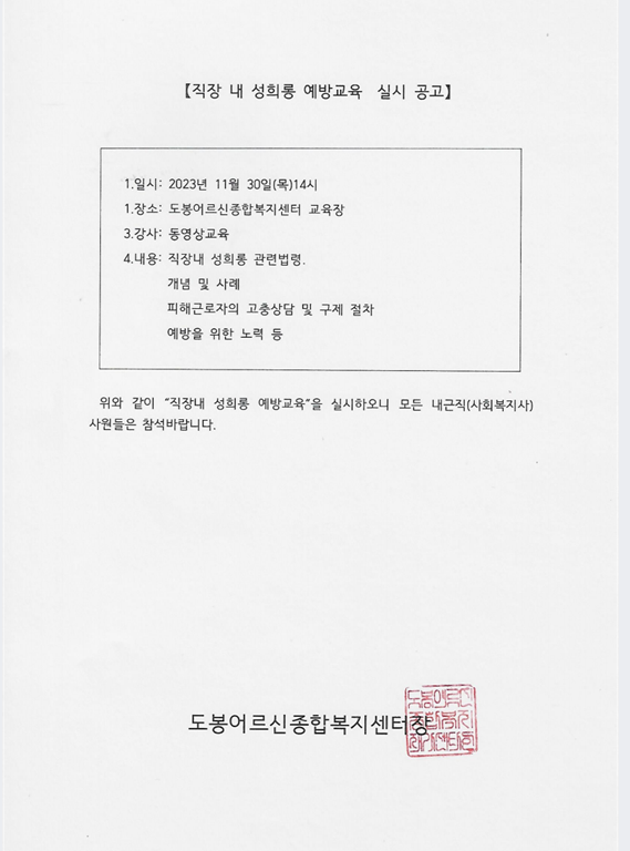 【2023년, 직장 내 성희롱 예방교육 실시 공고】