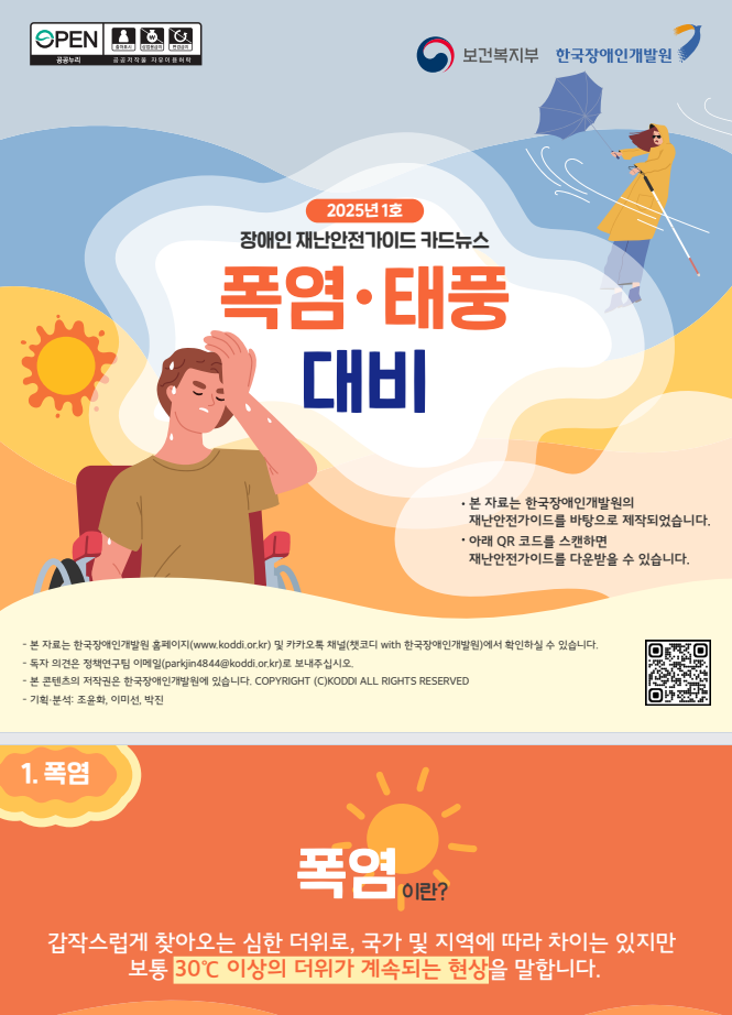 폭염 등 재난에 따른 장애인 재난안전가이드 전파, 안내 최고관리자 0 109 2025.08.05 16:50 2025.08.05 16:50 장애인 재난안전가이드 카드뉴스 2025년 01호.pdf (889.5K) + 2 안녕하세요? 폭염이 장기화됨에 따라, 활동지원사가 폭염 등 재난 시 적절하게 대응할 수 있도록카드뉴스 전파 등 관리하여 주시기 바랍니다. 감사합니다.