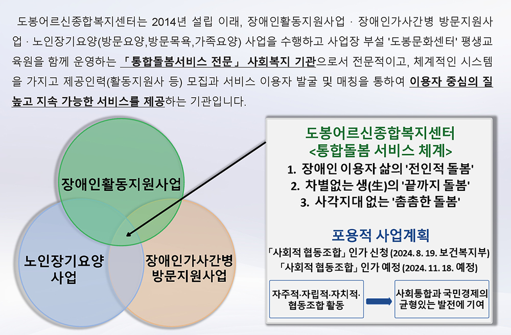 우리센터는 장애인활동지원 사업·장애인 가사간병 방문지원사업·재가장기요양(방문요양·가족요양)사업·